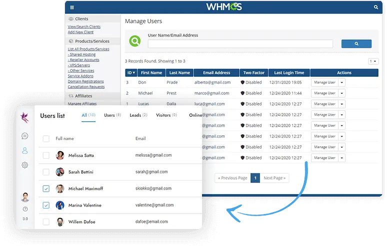 SMAIBOT, müşterilerinizin alanında sohbeti otomatik olarak görüntüler ve giriş yapan WHMCS kullanıcılarını otomatik olarak algılar ve kaydeder. Mevcut kullanıcıları manuel olarak da aktarabilirsiniz.